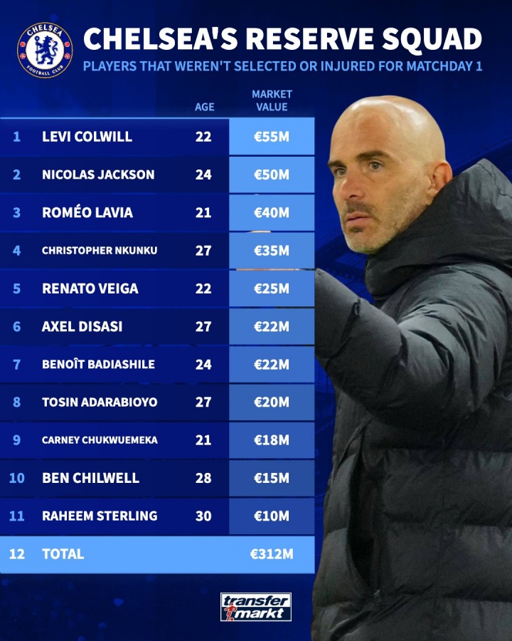 08月18日讯 英超第1轮,切尔西0-0战平水晶宫,据德转统计,切尔西本场比赛有11名一线队成员未入选名单,身价合计达到3.12亿欧。